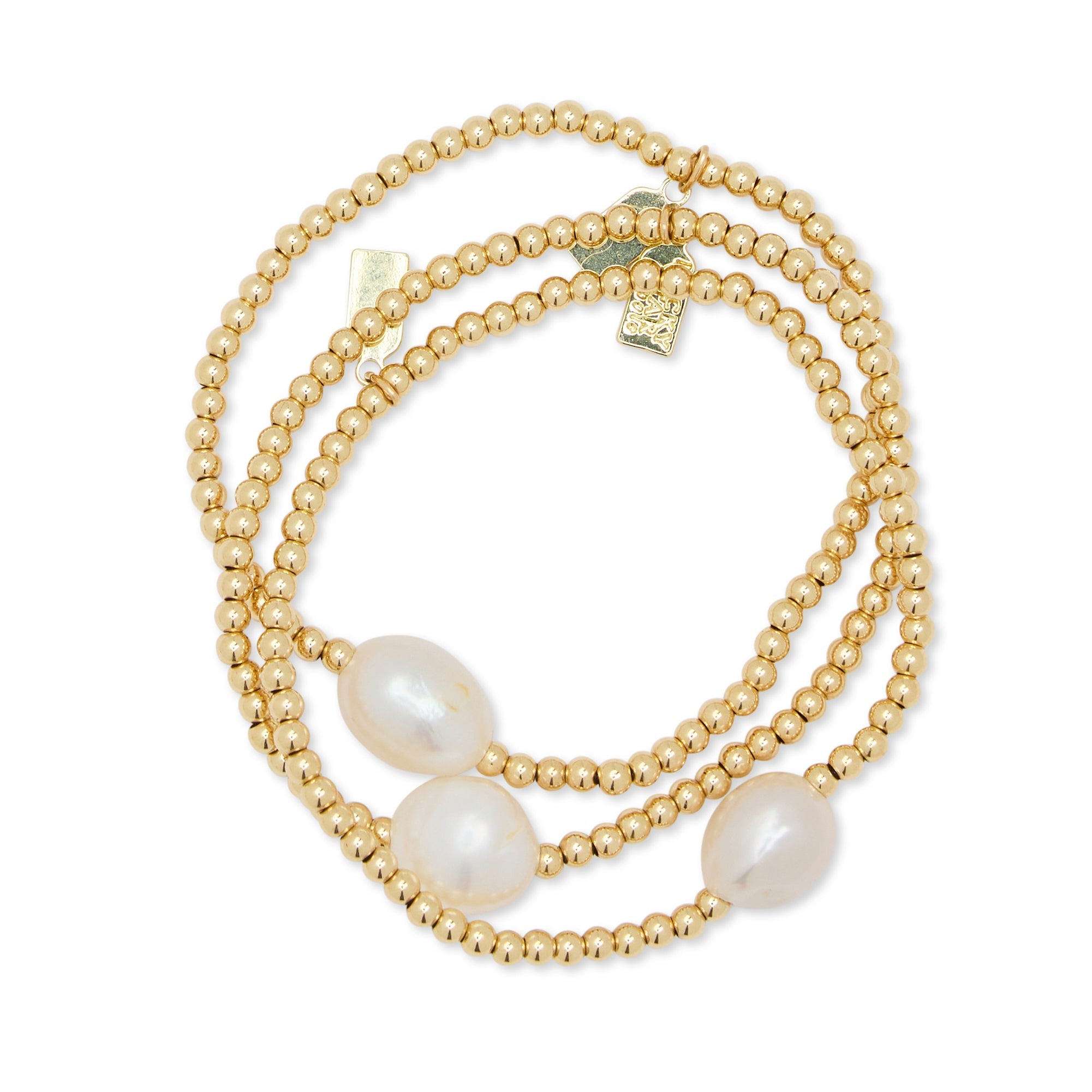 Natural pearl paired with 14k gold filled beads / one size fits all / stretch. These beauties are sold individually and are designed to stack. 14kt Gold-filled beads with genuine pearl accent. Pairs with our coco beaded bracelet.