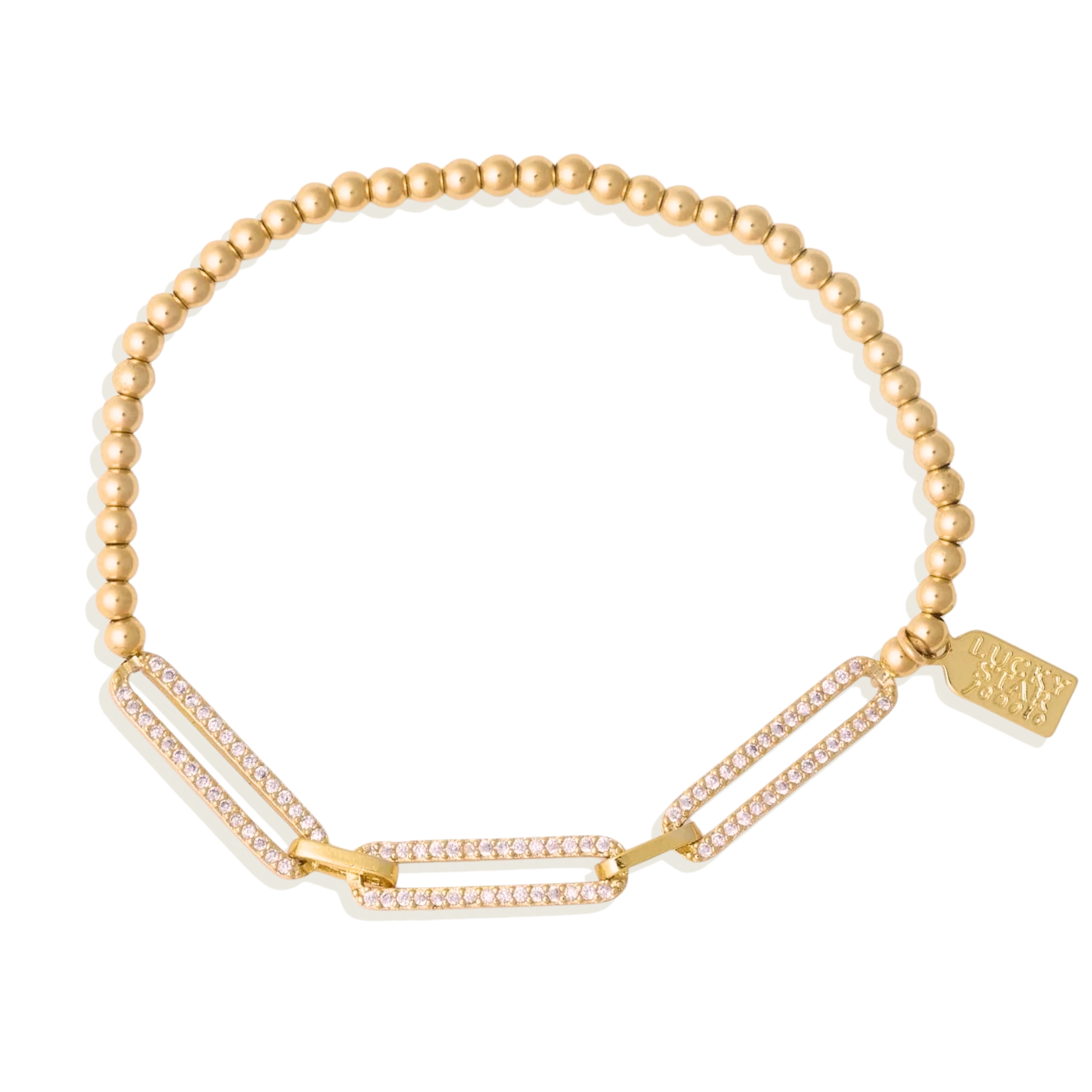 14kt Gold Filled 3MM Beads with 14kt gold plated brass chain. Features genuine CZ stones. One Size stretchable.