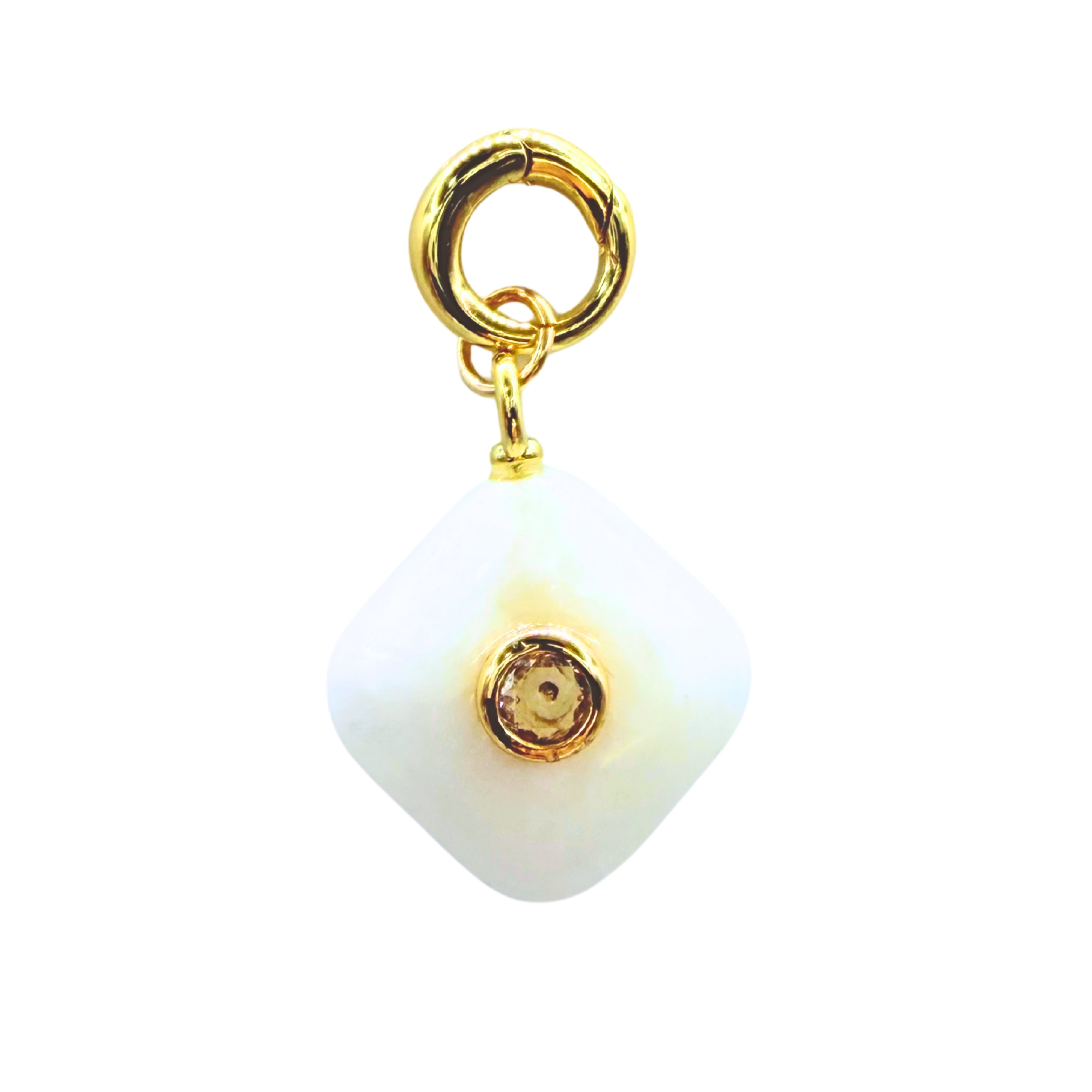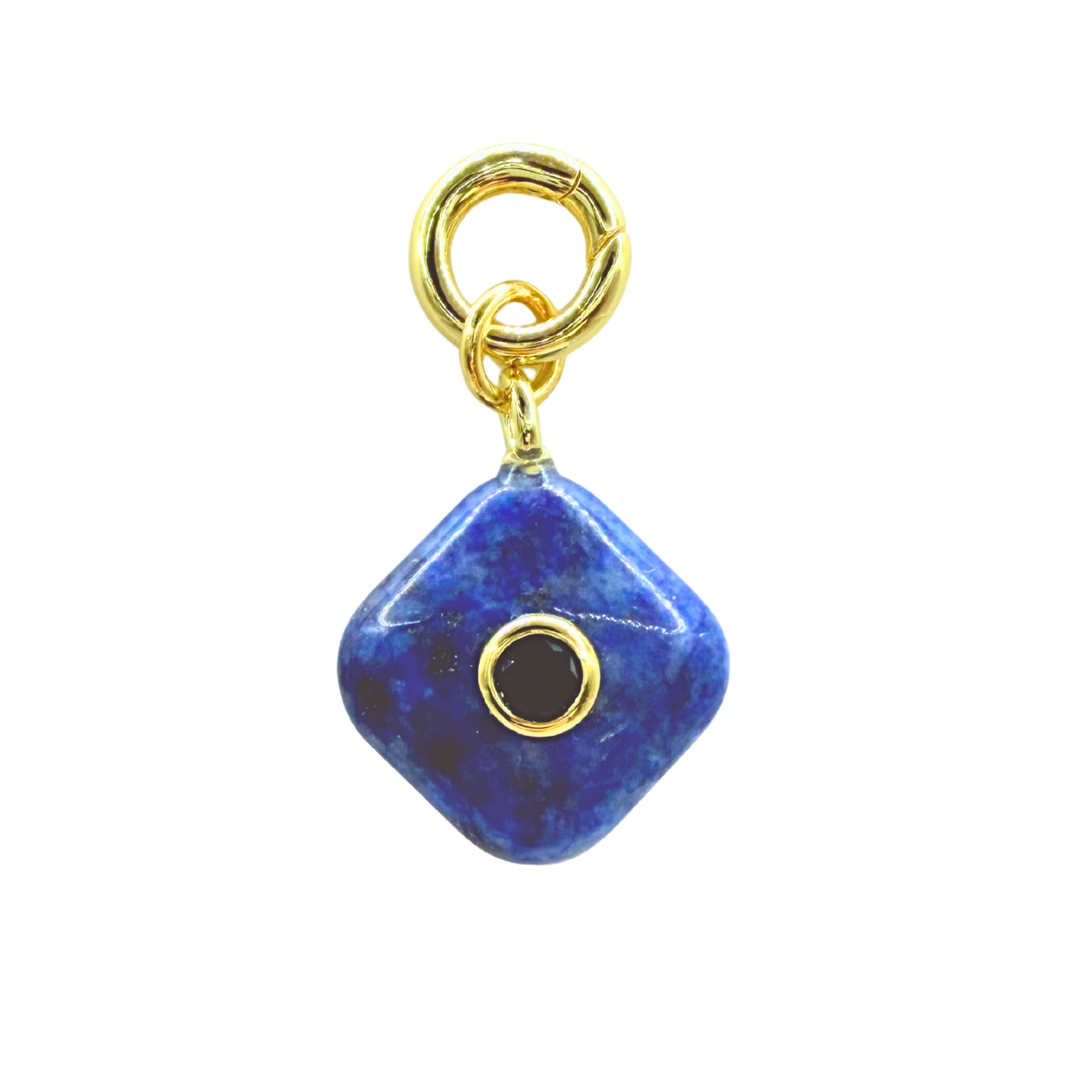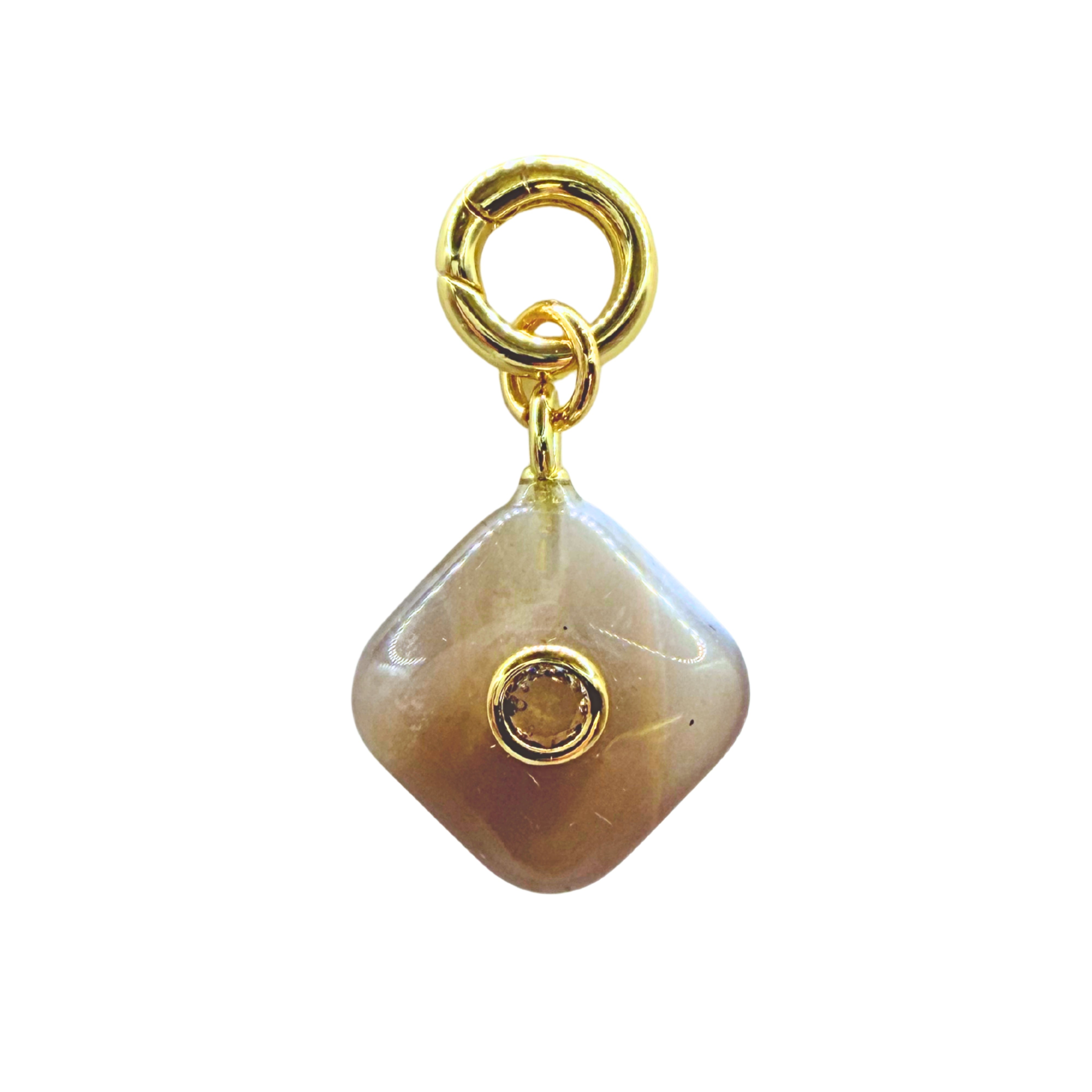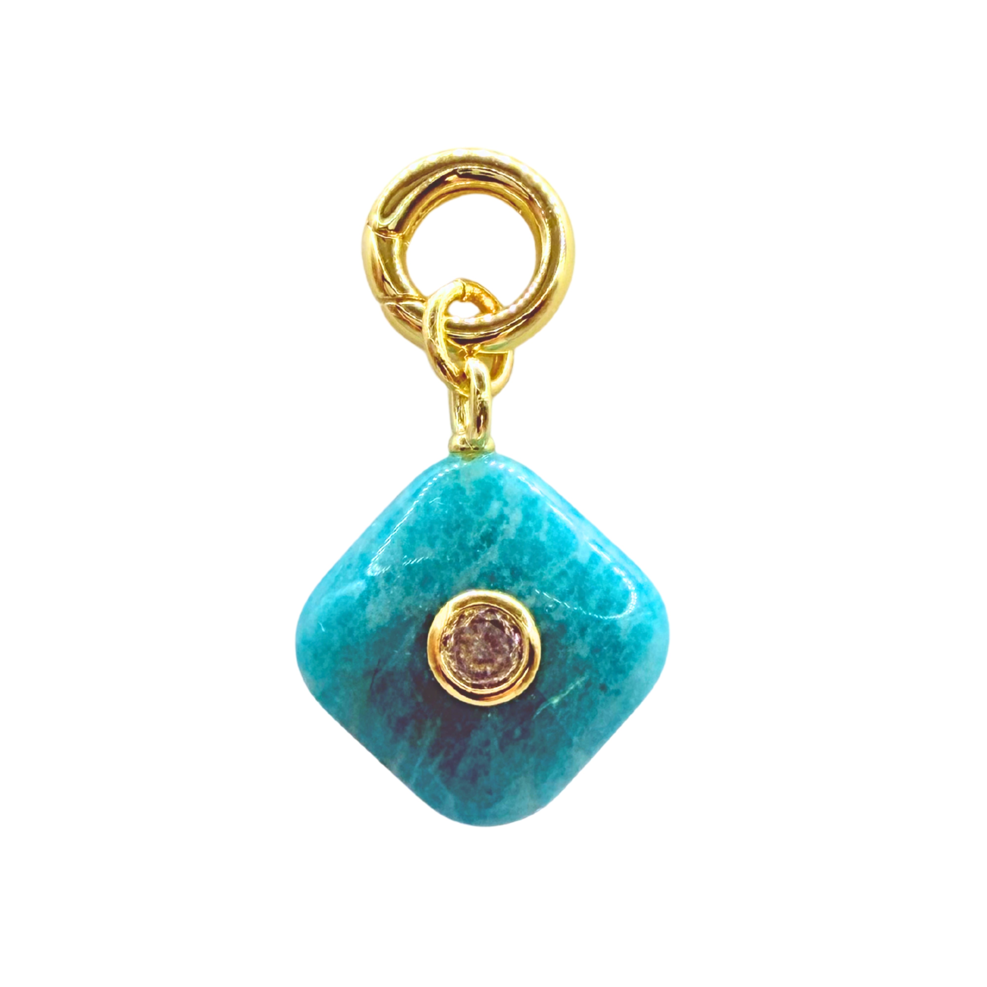 Genuine gemstone and CZ accents with 14K gold plated carabiner. Designed to layer with your existing Lucky Star collection or with our "Gem Candy Collection". 1.25" Drop with 3/4" gemstone pendant. Available In Amazonite, Sodalite, Nude Agate, Rose Quartz, and White Turquoise.