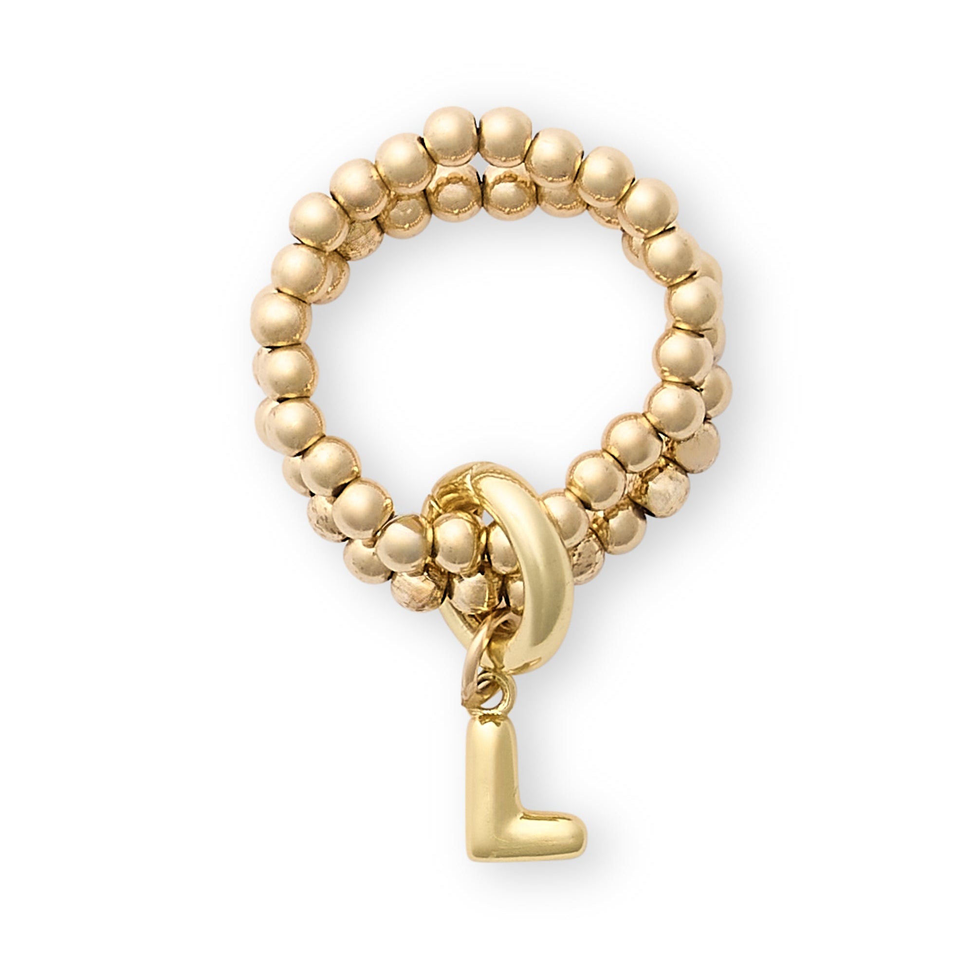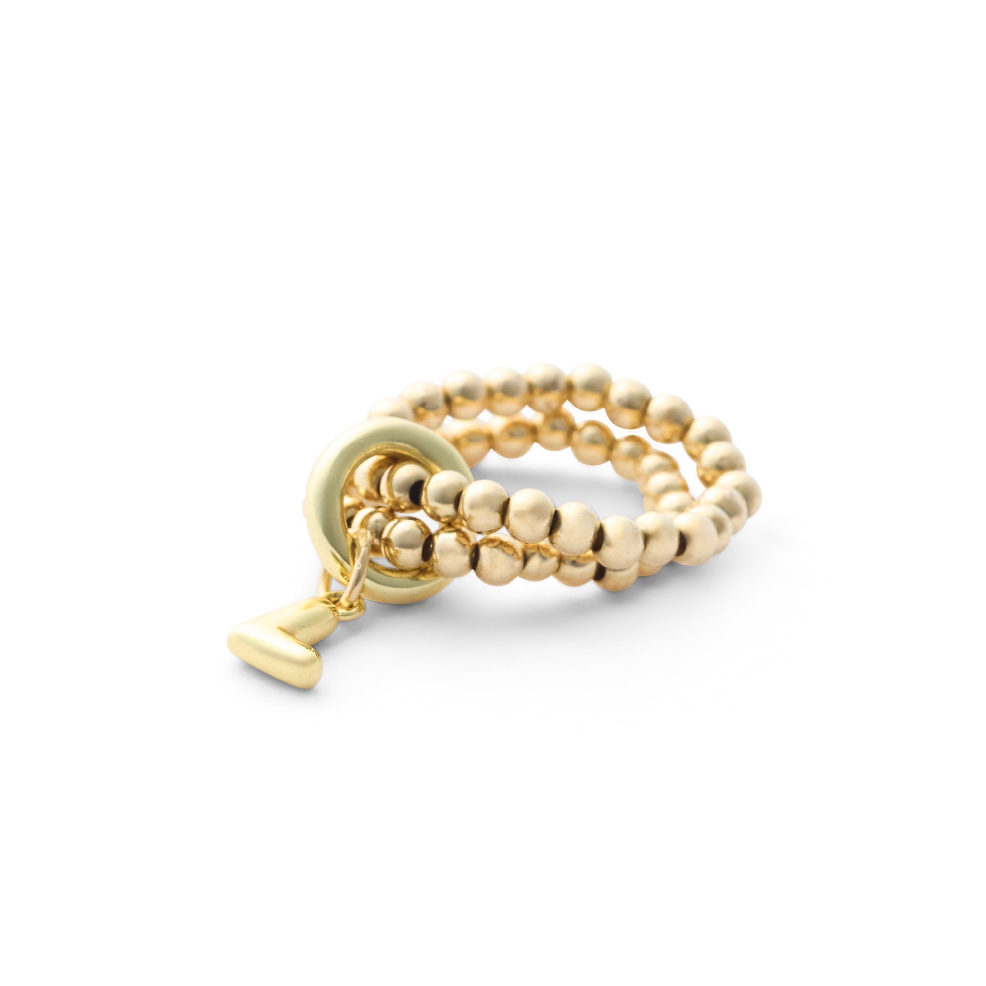 A little bubble can go a long way - make some big impact in our duo of comfortable, easy to wear stacking rings! One size; Stretchable. 14k Gold Filled 3mm beads and monogram charm with carabiner.
