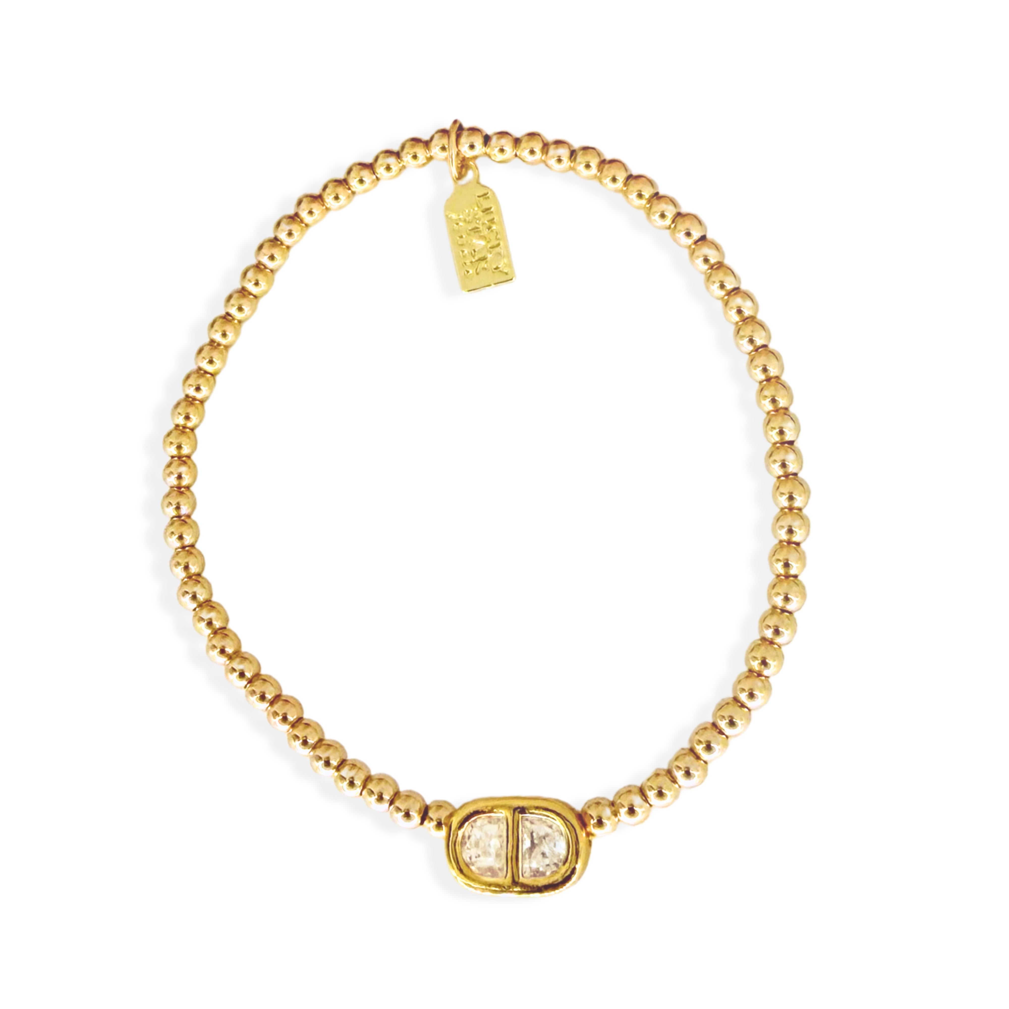The missing link your bubble bracelet collection needs! 14K Gold-Filled 3mm beads, featuring gold plated brass insignia charm with genuine CZ accents. Pairs with our insignia necklace and solitaire CZ collection. One size, stretchable.