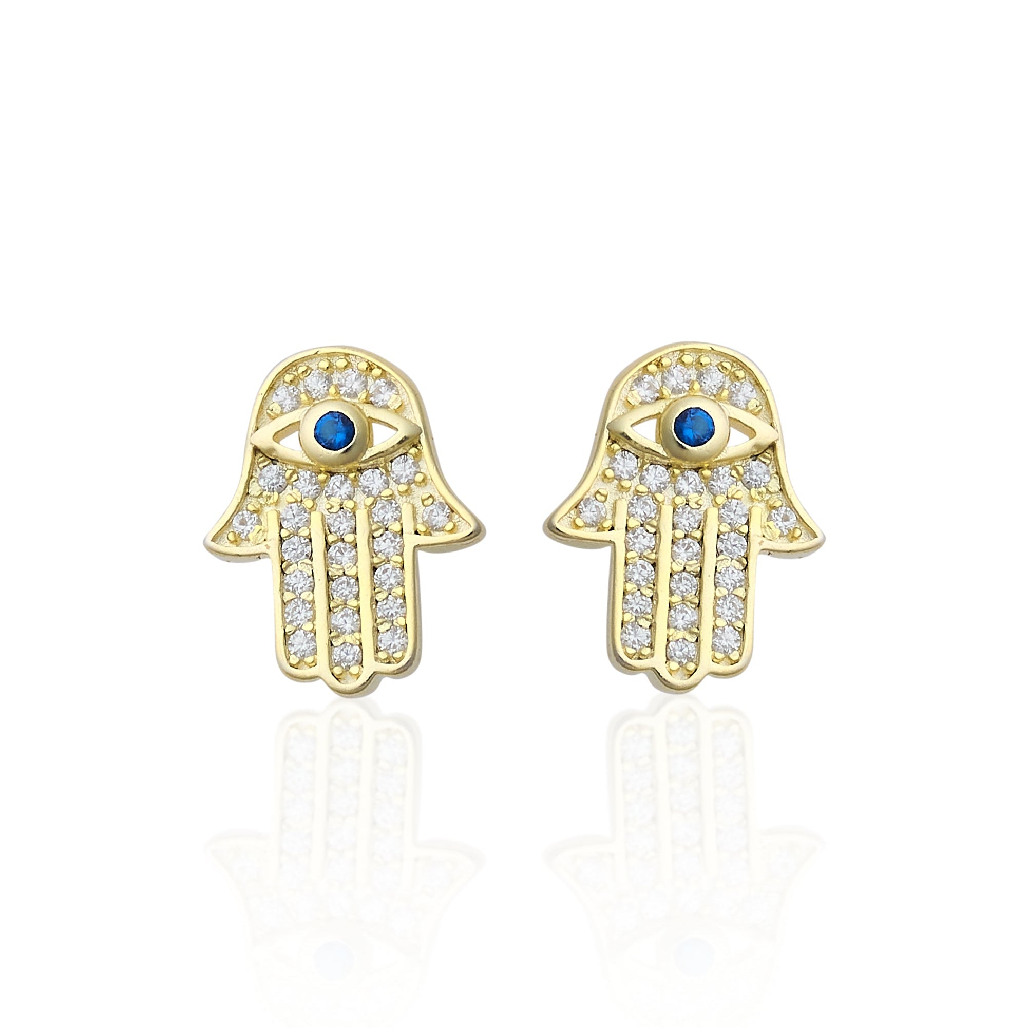 Hamsa Hand Motif Stud With Blue Accents Representing Protection And Good Fortune. Vermeil, Post Back. Lead + Nickel Free