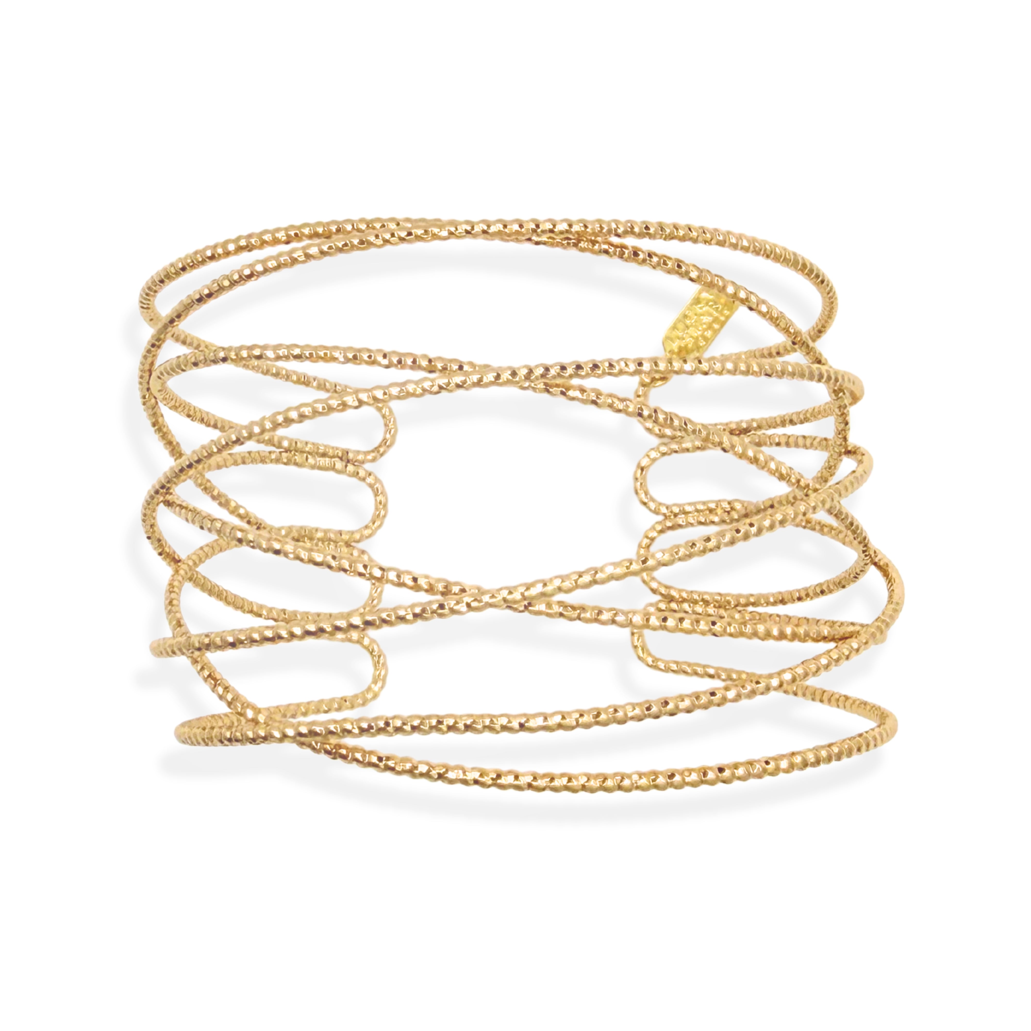 Our best selling "Twirl Cuff", just got even better! 14kt Gold-plated and .925 Sterling Silver-plated over brass textured cuff. One size; Adjustable. Available in gold and silver.