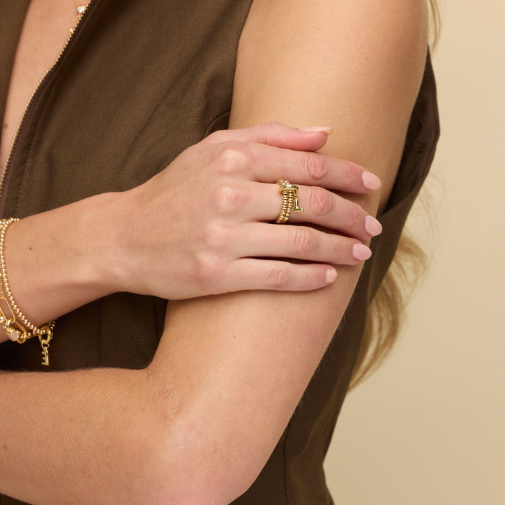 A little bubble can go a long way - make some big impact in our duo of comfortable, easy to wear stacking rings! One size; Stretchable. 14k Gold Filled 3mm beads and monogram charm with carabiner.