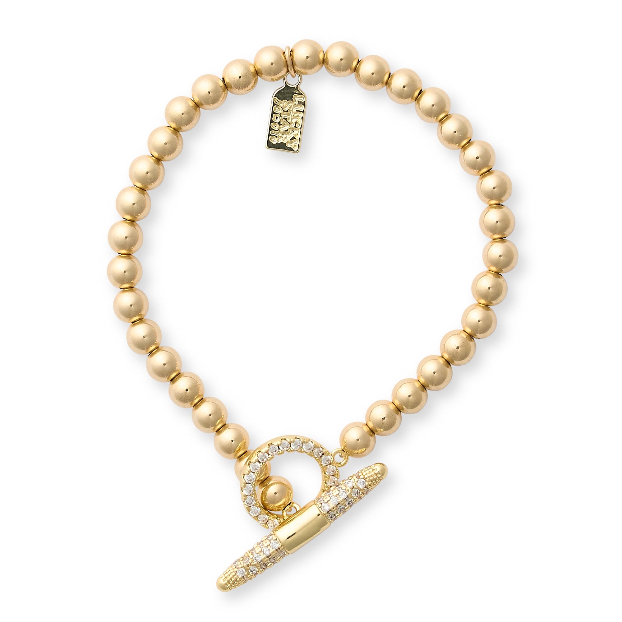 14K Gold Filled 5MM Balls. Featuring our iconic "CZ Toggle" accent, adorned with genuine CZ accents. One size, Stretchable.