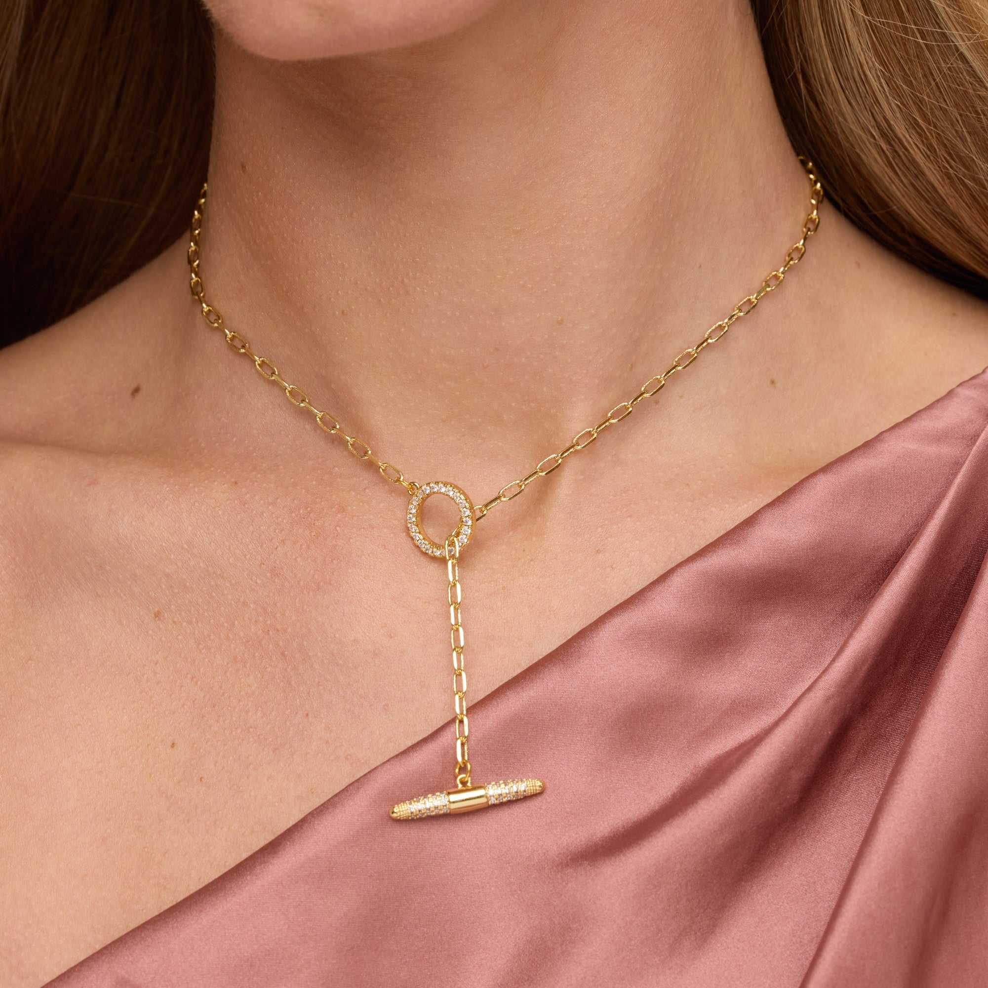 14kt Gold-Plated Over Brass. Measures 16" Long with genuine CZ toggle.